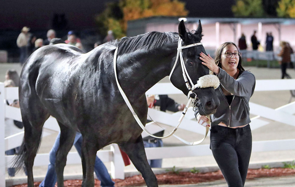 A happy Meadow MacLean leads her horse Silver Jaguar out of the winner’s circle after his victory on September 23 last year.