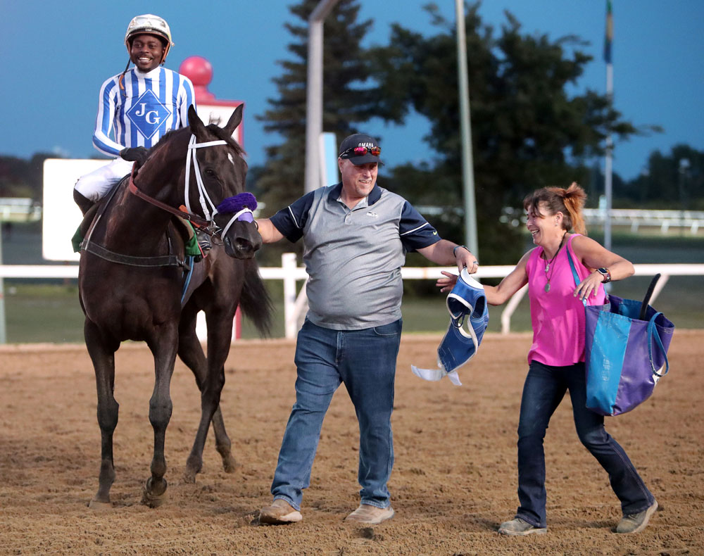 Manitoba-bred Betterlucknexttime gets a pat from jockey Antonio Whitehall as groom Brittany Bergen leads him into the winner’s circle after their victory in the Frank Arnason Sire Stakes for trainer Mike Nault. (Jason Halstead / Assiniboia Photo)